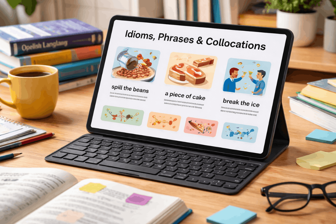 Understand and use common idioms, phrasal verbs, and natural word combinations to sound fluent and native-like.