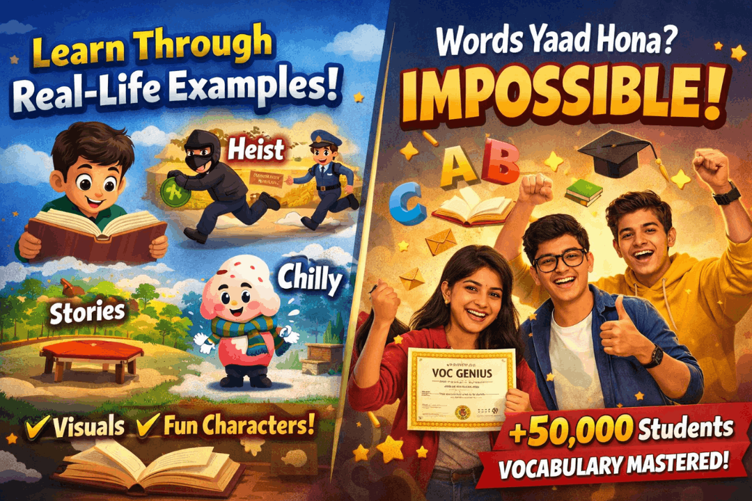 Ab asaani se yaad honge words - Stories, Visuals, or Mazedaar Characters ke saath. Words bhulna hoga impossible. +50,000 Students ne Vocabulary kar liya hai Master.